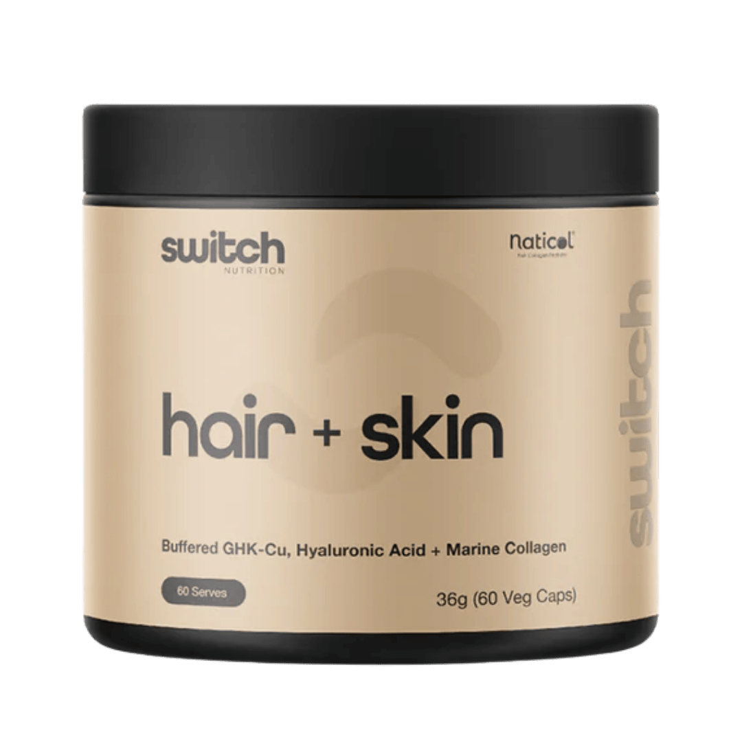 Switch Nutrition Hair + Skin Capsules are formulated as a comprehensive daily supplement to support healthy skin, hair, and connective tissue from the inside out. Each capsule delivers a synergistic blend of key actives - a copper peptide (GHK-Cu), marine collagen, and hyaluronic acid designed to support tissue renewal, collagen production, and hydration.