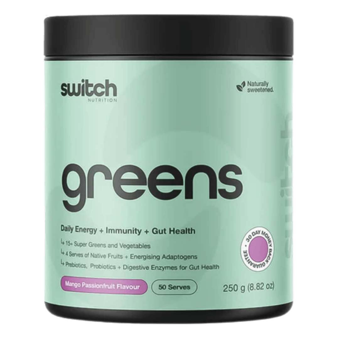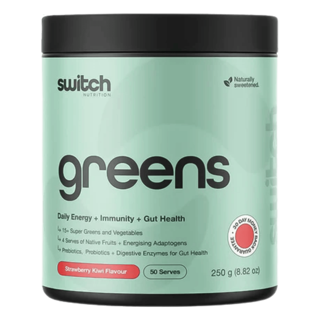 Greens by Switch Nutrition is a comprehensive daily greens powder formulated to help fill common nutritional gaps and support overall wellness. Packed with nutrient-rich greens, vegetables, superfruits, probiotics, digestive enzymes, adaptogens, and a bioavailable vitamin and mineral blend, this full-spectrum formula delivers a refreshing way to support energy, immunity, digestion and everyday vitality without the bitterness typical of traditional greens powders.