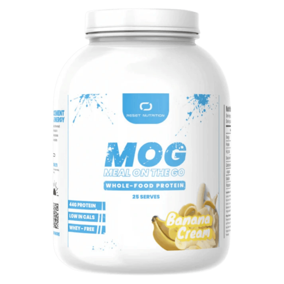 MOG Meal On The Go by Reset Nutrition is a plant based meal replacement powder that delivers balanced nutrition in every scoop. Formulated to combine real whole foods with modern convenience MOG provides sustained energy and essential nutrients for busy lifestyles. Each 50 gram serving supplies 20 grams of protein from pea and brown rice sources along with 25 grams of complex carbohydrates from oats quinoa and legumes. Healthy fats from chia seeds and flaxseed meal support brain function and hormone balance while five grams of fibre promote digestive health and help you feel satisfied until your next meal.